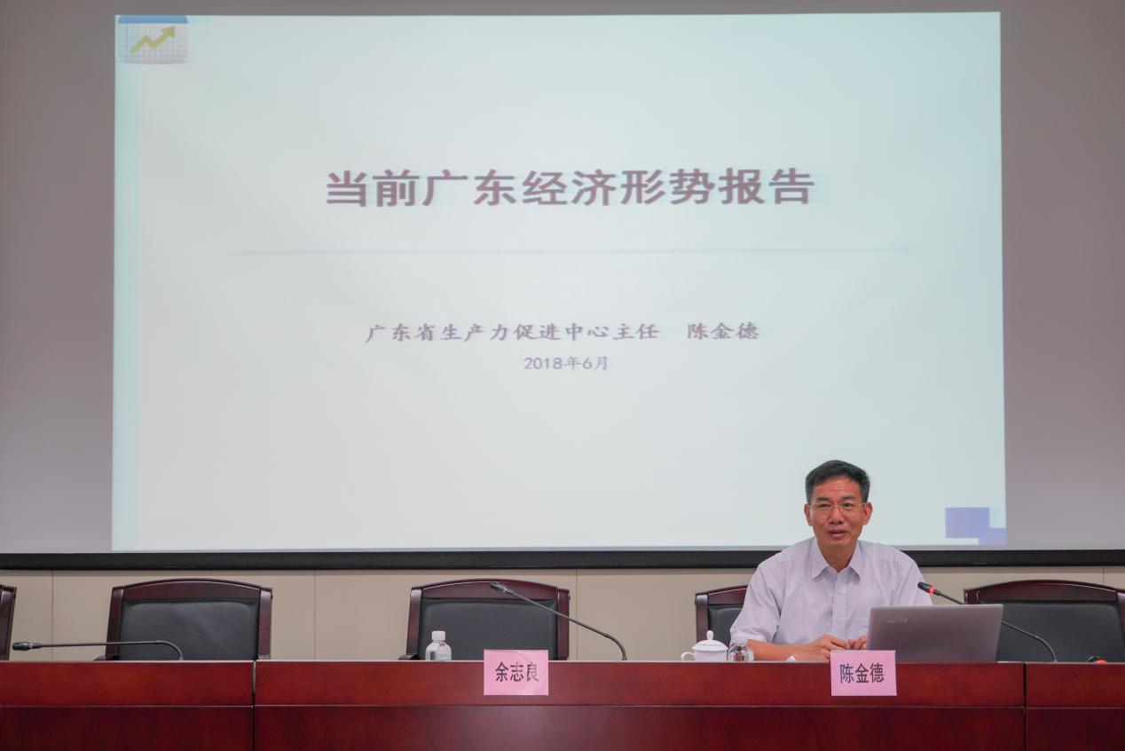 报告会上,陈金德首先介绍了我省一季度经济形势呈现“稳中向好”的发展态势,展望二季度及全年经济形势,认为全省经济将延续一季度平稳增长势头,有信心完成全年目标。陈金德指出,近十年来广东省经济综合实力显著增强,经济综合实力居全国前列,加快了对全球经济体的追赶。同时,广东省的经济增长动能正在转换,消费已经成为经济增长的主要推动力。十八大以来,广东省遵循习近平总书记的重要批示精神,特别是习近平总书记对广东提出的“四个走在全国前列”指示精神,在勇当改革排头兵,先行先试推动全面深化改革,大力实施创新驱动发展战略,构建开放型经济新体制、推动全面建成小康社会等方面发展成效显著。