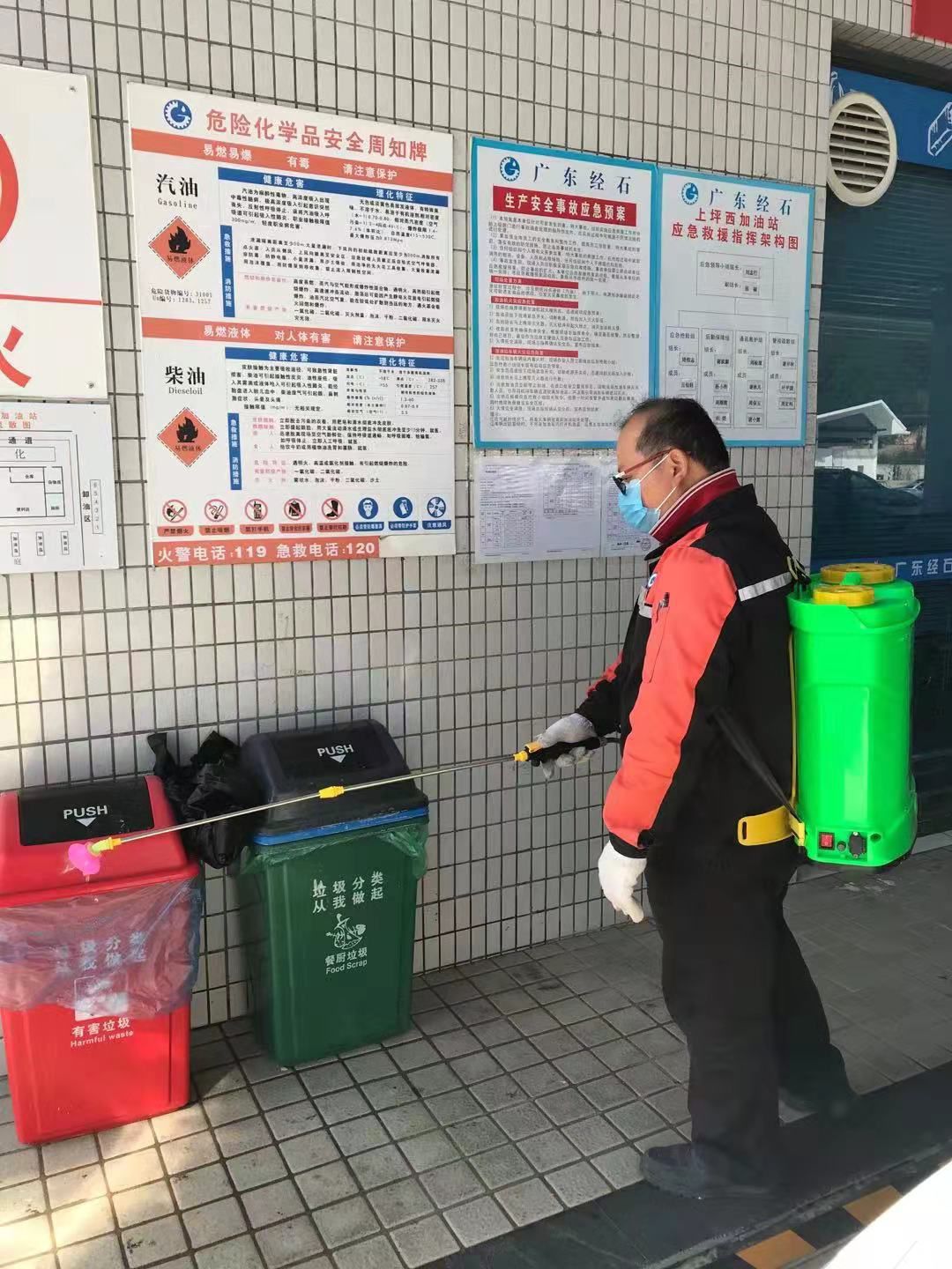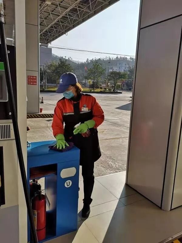 油站每班上岗第一时间对工作区域进行全面消毒。