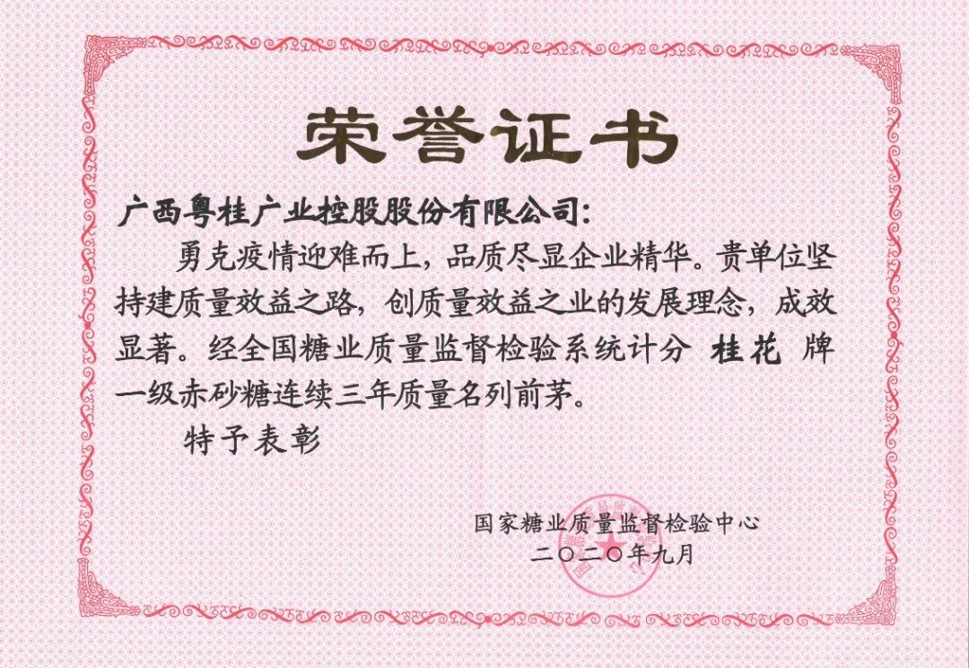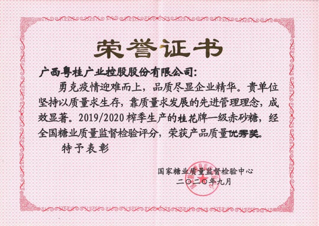 经全国糖业质量监督检验评分,广业控股粤桂股份生产的桂花牌一级赤砂糖以总分第一名(94.79分)位居榜首,摘得“产品质量优秀奖”,同时荣获“连续三年质量名列前茅”荣誉。